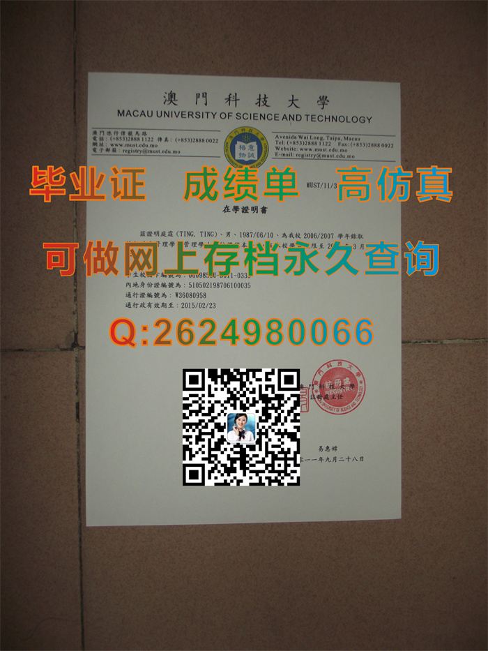 澳门科技大学在学证明书样本|澳门科技大学毕业证、学位证、文凭、成绩单购买|真实教育部留信认证入库存档